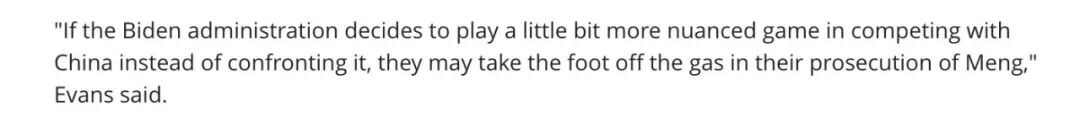 “如果拜登打算在这场中美博弈之中玩一点小心思而不是跟中国硬刚的话,他们有可能会在孟案上撤掉压力,”伊文斯教授预测到。