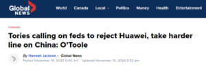 报道称,奥图尔的这番表态是在一场于当地时间15日播出的媒体采访中作出的。他宣称,其所在政党准备提出一项动议,要求联邦政府在30天内禁止华为参与该国5G网络建设。此外,他还敦促特鲁多所在自由党制定策略,应对中国在加拿大的行动以及所谓“(中国)政府代理人对加拿大人的影响和恐吓”。