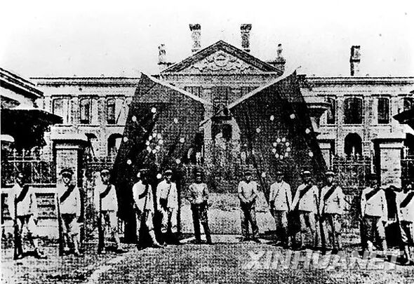 革命军占领武昌城后,军政府挂起象征十八省团结一致的十八星军旗。图片来源:新华社