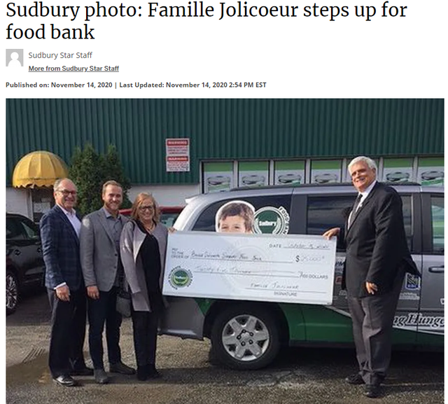 萨德伯里食物银行(SudburyFood Bank)的甜点艺术活动的赞助商FamilleJolicoeur得知今年该活动无法正常运行后,依然以家庭的名义捐赠了25,000加元给食物银行。