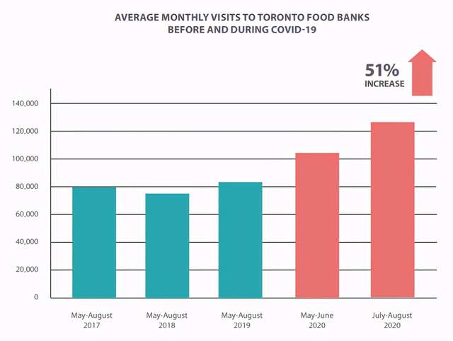 根据每日面包食品银行(Daily Bread Food Bank)的最新报告显示,由于疫情造成的经济不稳定,今年夏天在多伦多的食物银行访问量有所增加,6月食品银行访问量比去年同期增长了22%,与2019年相比8月增长了51%。