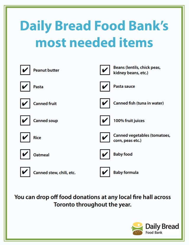 虽然在数量上,个人捐赠者的比例很小,但是却足以温暖我们。多伦多Daily Bread食物银行也给出了急需食品清单,市民在超市购物的时候捐献食品,也可以直接捐给食物银行分站。