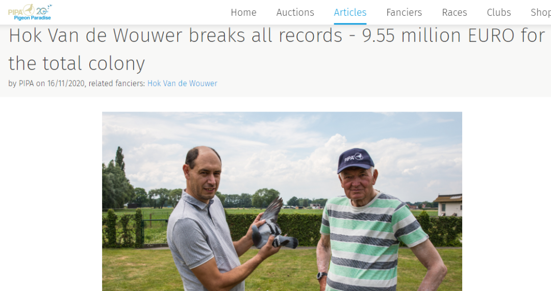 线上鸽子拍卖机构“鸽子天堂”主席尼古拉斯·吉赛布赖特告诉法新社:“我认为这个竞拍价创下世界纪录,从没有正式拍卖记录记载这样的拍卖价。”他说,那名买家可能将“新金”用于繁育优良鸽种。