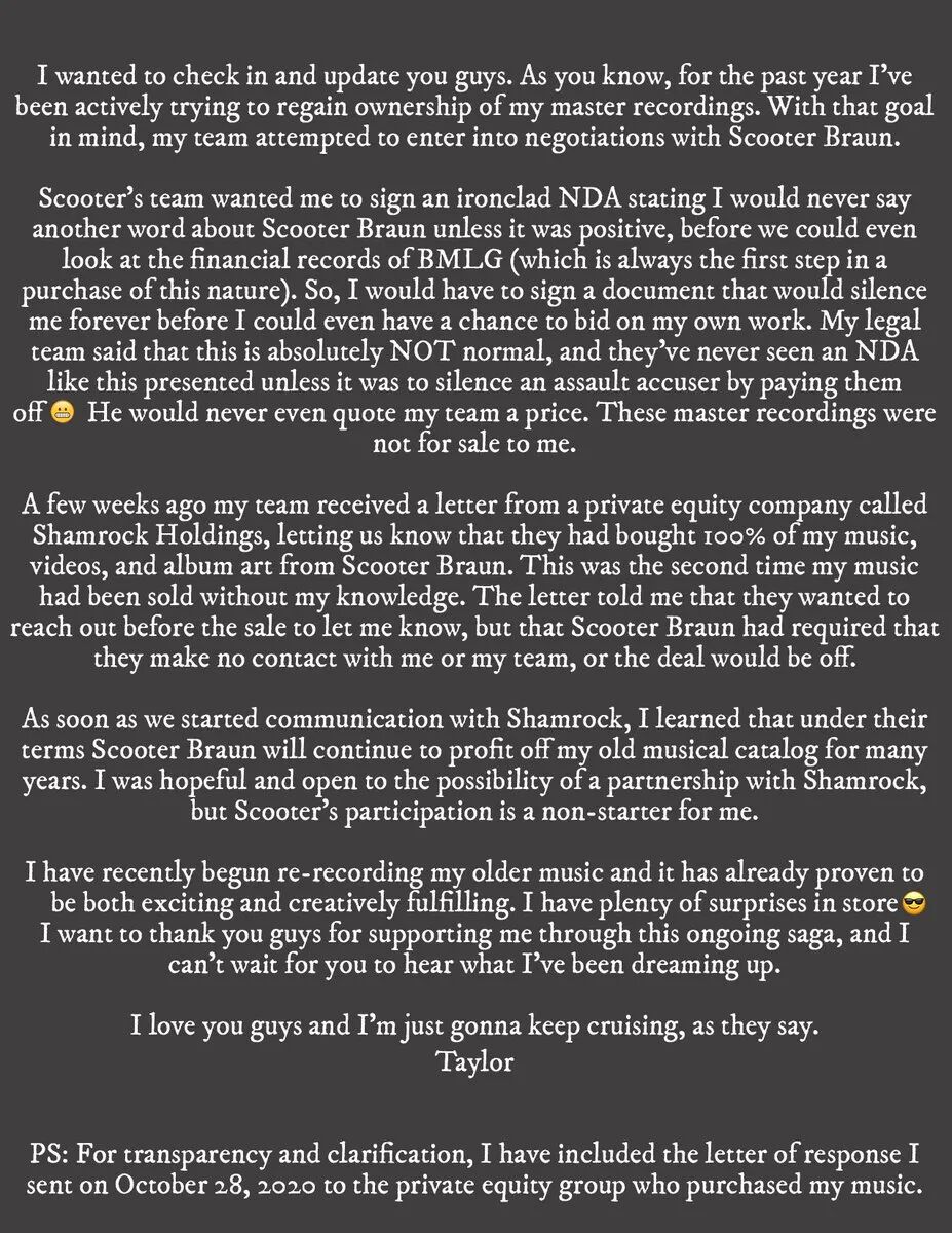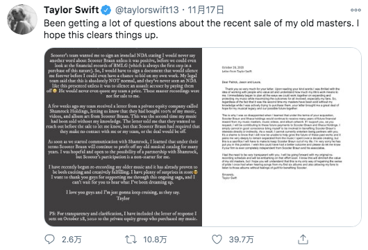 11月17日,霉霉在自己的推特发表了声明:“在过去的一年中,我一直在积极地尝试重新获得主唱片的所有权。这是第二次我的作品在我不知情的情况下被出售。”