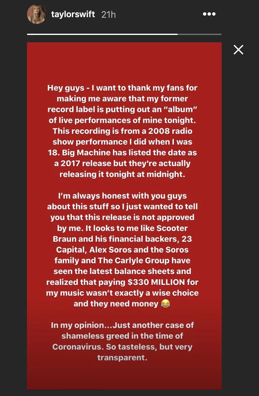 “在我看来,布劳恩和他的财务支持者,23 Capital,Alex Soros以及Soros Family和The Carlyle Group,已经看到了最新的资产负债表,并意识到为我的音乐支付3.3亿美元并不是一个明智的选择。而且他们需要钱,”她在Instagram上写道。“我认为……在疫情期间他们的表现无耻而贪婪。”