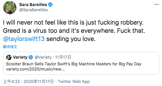 专辑被转卖的消息传出后,萨拉·巴雷莱斯(Sara Bareilles)是率先支持Swift的明星之一,她在推特上@了霉霉,并写到:“爱你并支持你。贪婪也是一种无处不在的病毒,去他的吧。”