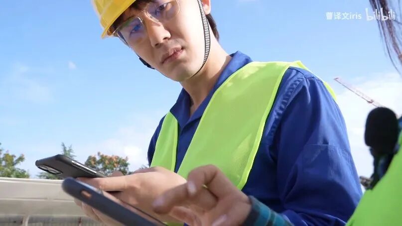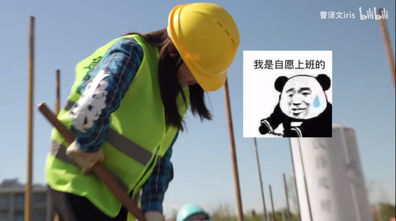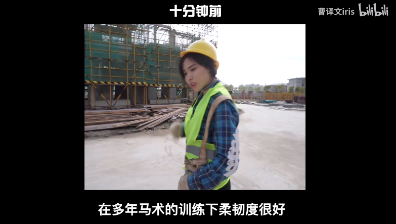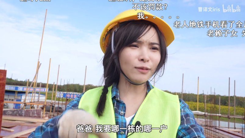 在视频的最开始,曹译文画好了精致的妆容,穿着格子衬衫和方便活动的裤子,化身为“搬砖小妹”。
