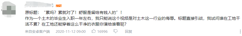 “作为一个土木的毕业生入职一年左右,我只能说这个视频是对土木这一行业的侮辱。标题直接引战,我试问谁在工地干活不累?在工地还能穿着这么干净的衣服你演给谁看呢?”