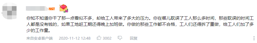“你知不知道你干了那一点看似不多,却给工人带来了多大的压力。你在哪儿耽误了工人那么多时间,那些耽误的时间工人都是没有钱的,如果工地赶工期还得晚上加班做。你做那些工作都不合格,工人们还得拆了重做,给工人们加了多少工作量。”