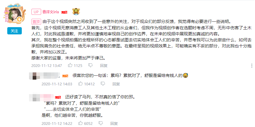 尽管曹译文在视频引起争议喜提流量后,置顶了为选题道歉的评论。