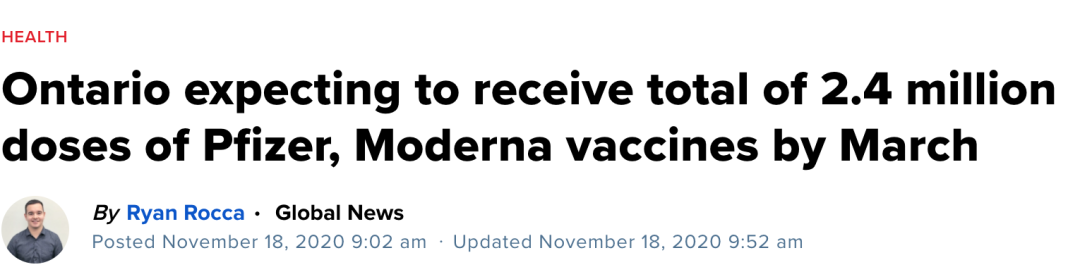 与此同时,加拿大安省卫生厅厅长也在18号向Global News确认将从2021年1月开始,陆续收到来自辉瑞的160万支疫苗和Moderna的80万支疫苗,合计240万支疫苗最迟将在3月份到位。这是首批运往加拿大的疫苗,因此数量有限,而且因为这两家的疫苗都需要打两针,也就是说,到时只会有120万安省人能够接种。