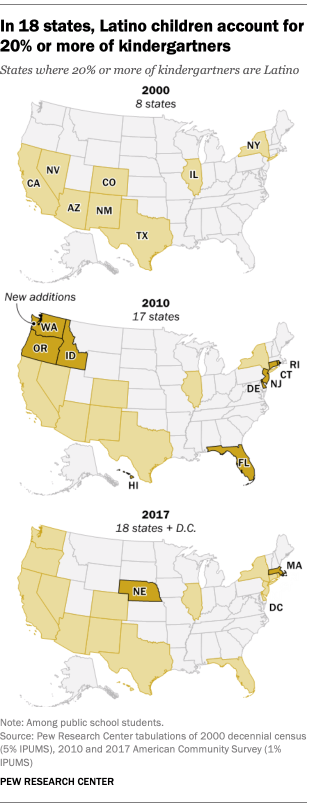 2019年7月,皮尤研究中心发布报告,称美国幼儿园和中小学中白人幼儿和青少年比例持续下降,少数族裔比例持续上升,预计2019年秋季入学时,白人学生占比约为47%,而少数族裔继续增长,其中拉美裔学生占比28%,非裔占比15%,亚裔占比6%。