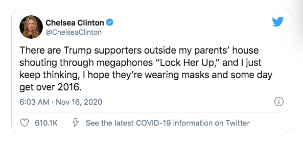 2020年了,特朗普的支持者还是没有放弃这个口号。据英国《独立报》报道,11月16日,美国前总统克林顿和总统竞选人希拉里的女儿切尔西·克林顿(Chelsea Clinton)证实,确实有特朗普的支持者来到她父母的住所并大声叫喊这一事发生。