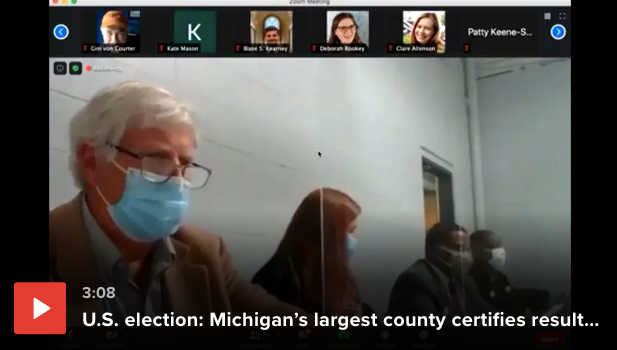 11月17日,在密歇根州,该州最大县的两名共和党选举官员——帕尔默和哈特曼——尽管没有任何欺诈证据,但最初拒绝选举结果认证(后在民众强烈的谴责下同意);而在亚利桑那州,共和党官员们不愿在一个郡签署投票记录。