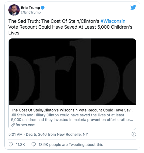 2016年美国大选时,特朗普以近2万3千票赢得威斯康星州胜利后,当时绿党候选人吉尔·斯泰因(Jill Stein)申请了威斯康星全州范围的重新计票。而2016年成为当选总统的特朗普,则无情地嘲笑那些努力,称斯泰因的举动是:“骗局,旨在通过这种方式中饱私囊,并且不会把筹到的大部分资金用于这次荒谬的重新计票。”并强调连希拉里都已经承认败选了。
