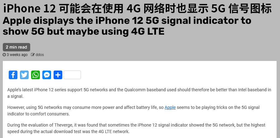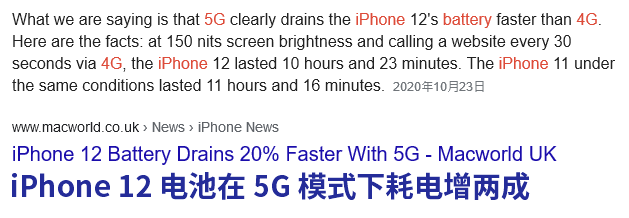 之前有外媒测试了 iPhone 12 的 5G 。结果发现相比使用 4G ,启用 5G 网络的耗电增加了 20% 。