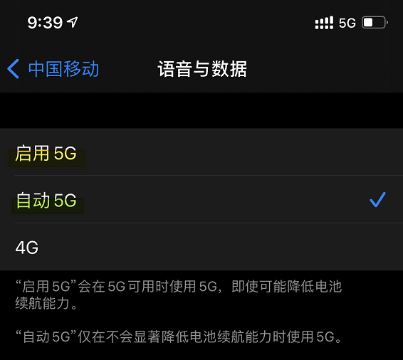 原来, iPhone 12 的 5G 设置界面里有两个选项,一个叫 “ 启用 5G ” ,一个叫 “ 自动 5G ” 。