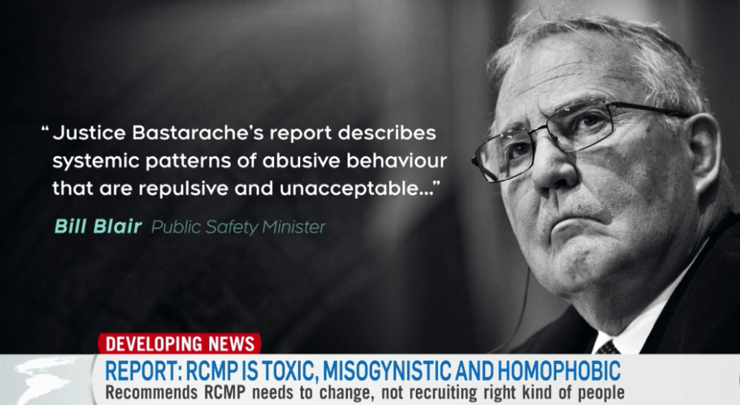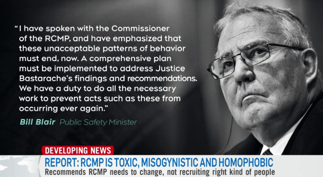 公共安全部长Bill Blair在下午的新闻发布会上现身,表示:“这份报告暴露出的系统歧视行为令人发指(repulsive),绝对不可接受。“他说,“没有人应该在工作场所遭受歧视和骚扰,但是我们知道,这对于在皇家骑警和加拿大的许多女性和同志员工来说却是每天要面对的现实。”