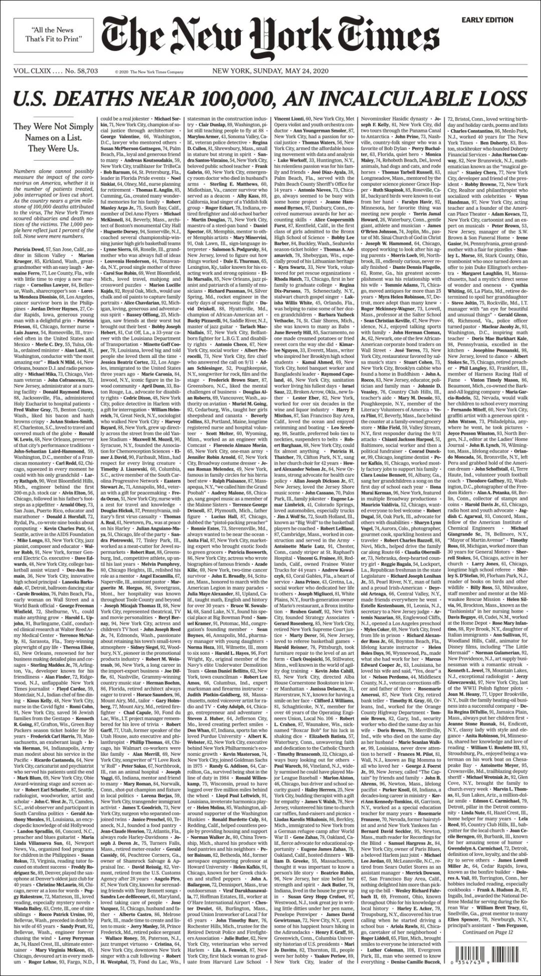 我有时候甚至觉得美国政府在赌。《纽约时报》在美国死亡人数达十万人时,发布了一整版的讣告。上面是1000位逝者的名字。