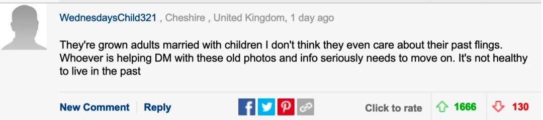 他们都是成年人,结了婚,有了孩子。我想他们根本不在乎过去的风流韵事。那些帮助邮报做这些旧照片和信息的人真的需要离开了,活在过去是不健康的!