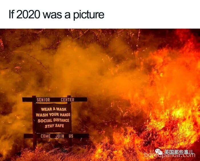 养老院的指示牌上还写着“戴口罩、勤洗手、保持社交距离、保持安全”,就这样树立在大火之中…