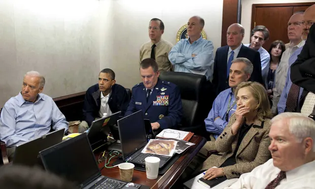 2011年5月,美国政府发布一张奥巴马等人在白宫战情室监测击毙本·拉登行动的照片。照片中,穿着蓝色衬衫的布林肯站在靠门的位置,探出头来看着前面的大屏幕。