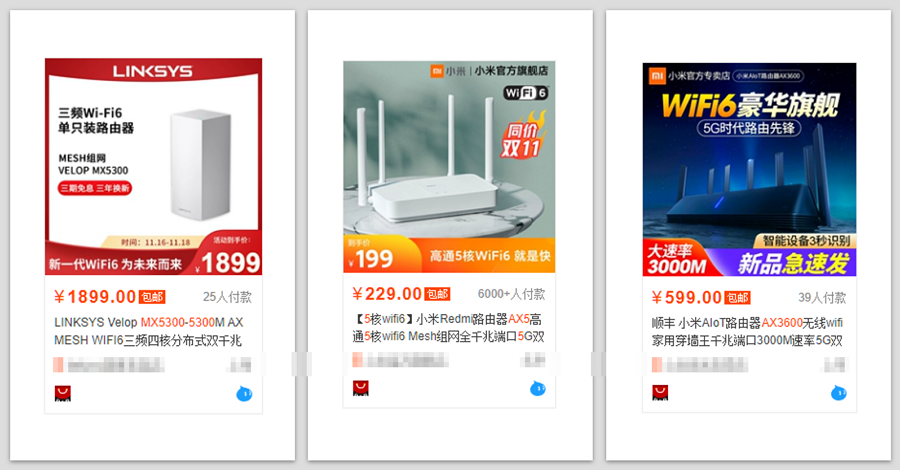 但即使都用的 Wi-Fi 6 技术,也有 200 元的红米、 不到 600 元的小米,以及 1899 元的领势 Velop 。
