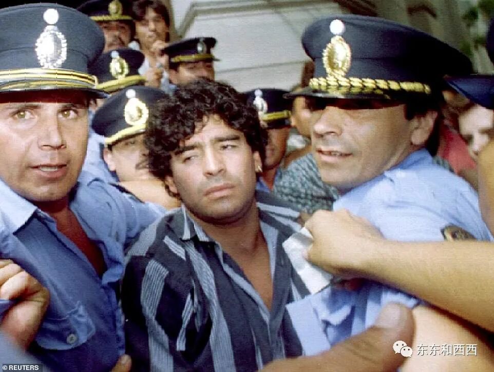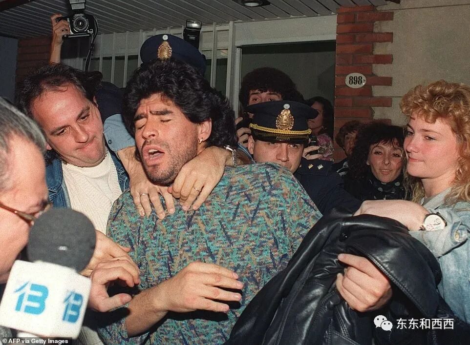他从意大利逃到阿根廷,但也因持有可卡因被捕,当时的照片显示,泪流满面的马拉多纳被警察带走↓↓