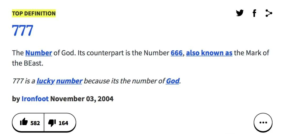 Urban Dictionary这样解释:777是“The number of God”(上帝的数字),而666是“mark of the beast”(野兽的印记)。