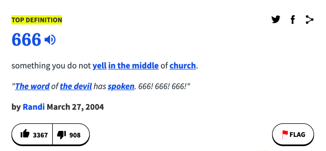 但是,6 在西方是一个邪恶的数字,别懵圈,先看看 Urban Dictionary 上的网友是如何解释666这个数字的: