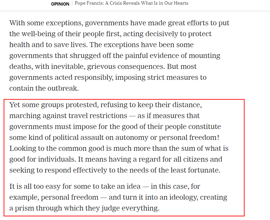 由此可见,在罗马教皇方济各看来,各国政府出台的那些严格的防疫措施并不是什么侵犯个人自由,而是为了公共利益着想而不得不采取的措施,反倒是一些人不断地滥用个人自由的名义去反对政府的防疫措施,是一种很自私的行为。