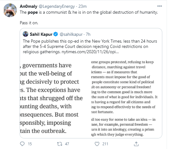 他们反而还给方济各扣上了“假教皇”以及“共产党”的帽子,称他这是要“毁灭人类”……