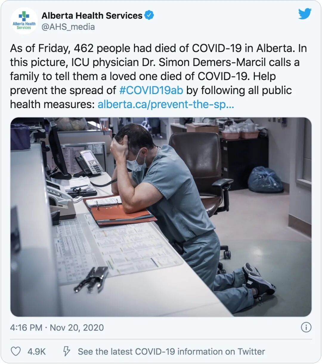 照片中的Dr.Simon Demers-Marcil医生负责通知因感染新冠而离世的患者家属,都说“男儿有泪不轻弹”、“男儿膝下有黄金”,但是Marcil医生却在打电话的全程双膝跪地。其实他诚恳而专注的样子,患者家属在电话里是看不到的,但是他坚持这样打完一个个电话,那种郑重,透过画面感染了无数加拿大人。