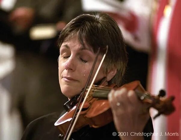 这是9.11事件后在温哥华举办的一场音乐会,小提琴手在演奏中动情地流下泪,为不幸事件中丧生的人们默哀。