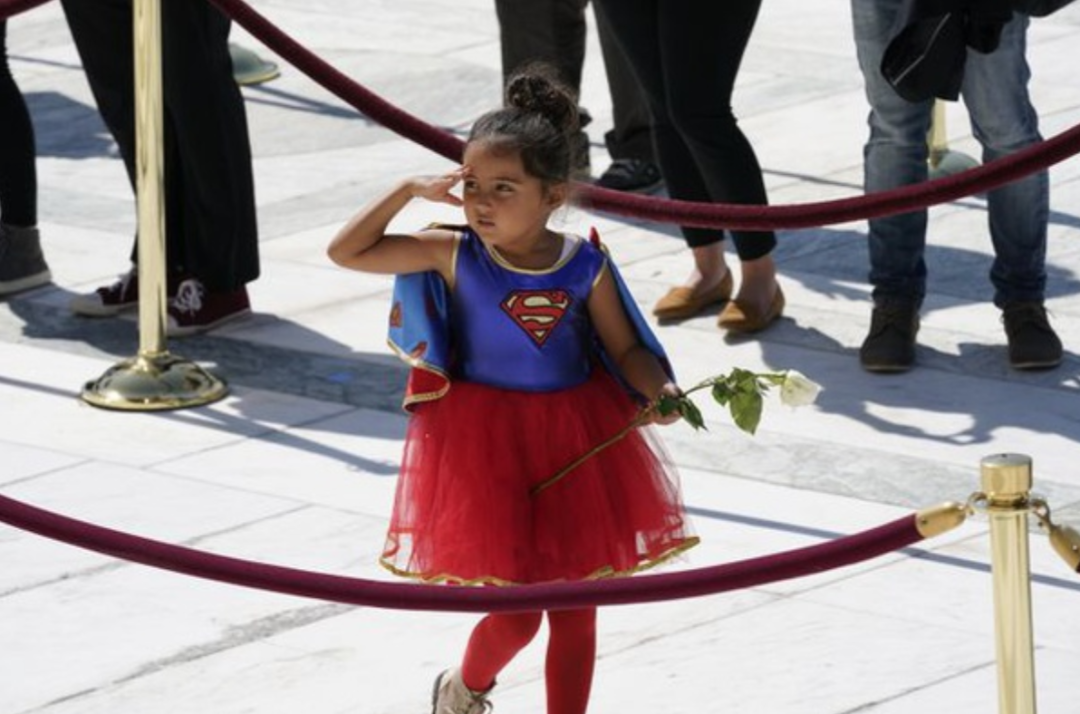 在女法官金斯伯格的葬礼上,身穿女超人服致敬的小女孩,将来有一天,愿你也能站上司法世界的战场,成为维护社会公平的女斗士。