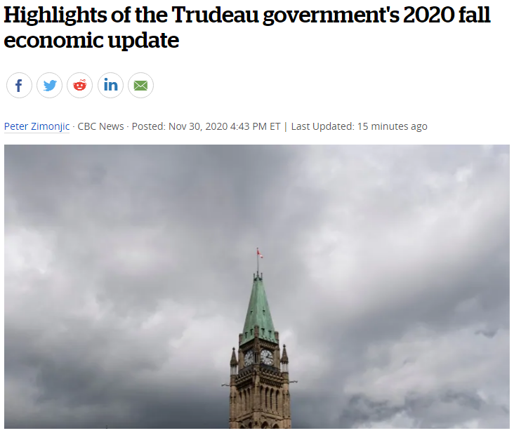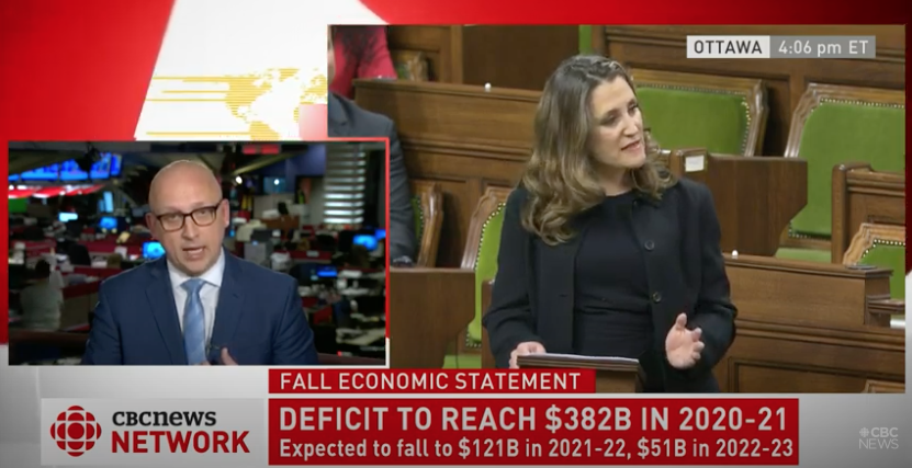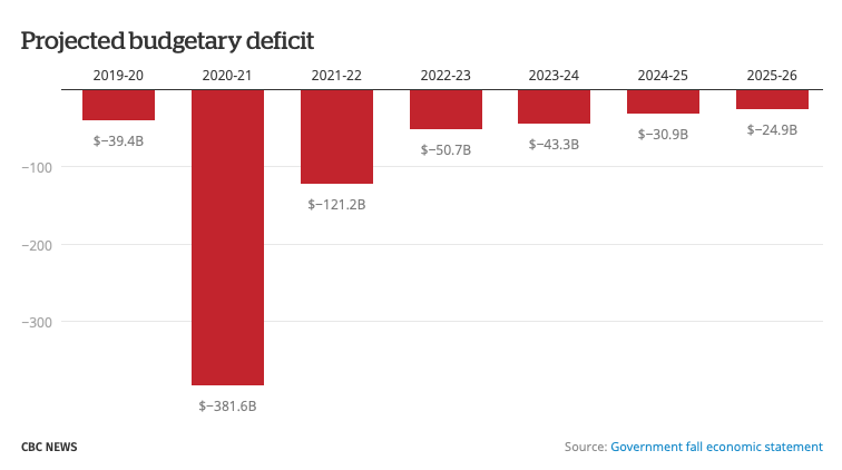 今天的财政最新报告预测,到2021年3月底,赤字将达到3816亿加元,并且根据封锁程度和新冠感染率等因素,这项赤字可能还会增加。