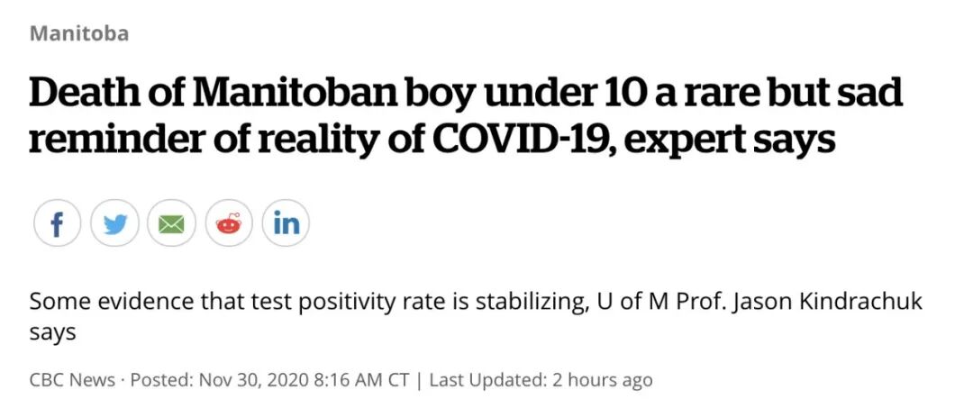 BCCDC仅在11月15日至21日这一周得到的检测数据表明,15-19岁人群中有近10%的人检测出COVID-19呈阳性(这是那一周所有年龄组中最高的阳性率)。自大流行开始以来,已有18名10岁以下儿童住院;11名年龄在10-19岁的青少年患者已不得不住院治疗。虽然BC省还没有哪个孩子需要进ICU抢救,但是就在刚刚过去的星期六(28号),曼尼托巴省温尼伯市已经有一名10岁以下儿童,因感染离世。这是该省年纪最小的Covid-19患者。