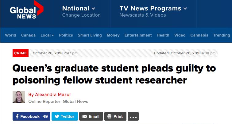 2018年10月,加拿大皇后大学的中国博士留学生王子杰(音译),因毒害自己的室友被判处7年,遣返回国,却仍无悔改之意….