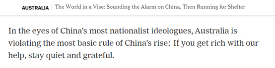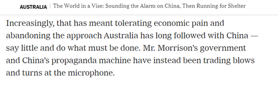 另外,《纽约时报》还在最新的这篇报道中分析说,恰恰是因为澳大利亚如此迫切地希望取悦美国,所以该国在近些年才会不顾中澳的经贸关系,处处挑衅中国,并频繁地与中国“打嘴仗”。