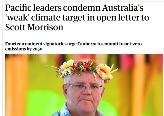 截图来自英国《卫报》的报道,内容是南太平洋各岛国最近联名写信谴责澳大利亚莫里森政府在气候变化上不作为,导致这些岛国不得不面对着气候危机所带来的灭国风险