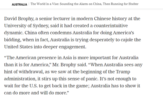如下图所示,在这篇分析中澳关系的报道中,《纽约时报》采访的一位来自澳大利亚悉尼大学的专家就表示,虽然中国常常指控澳大利亚听命于美国,“但实际上,是澳大利亚在拼命地撺掇美国来进一步加深与澳大利亚的关系”。