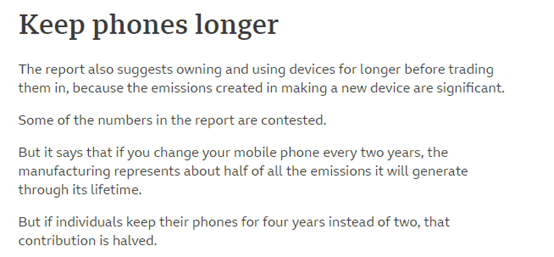 另外,这份报告还提出,人们如果能把目前2年更换一次手机的习惯,改为4年换一次,这也将为节能减排做出贡献。因为这将减少电子产品生产时排除的温室气体。