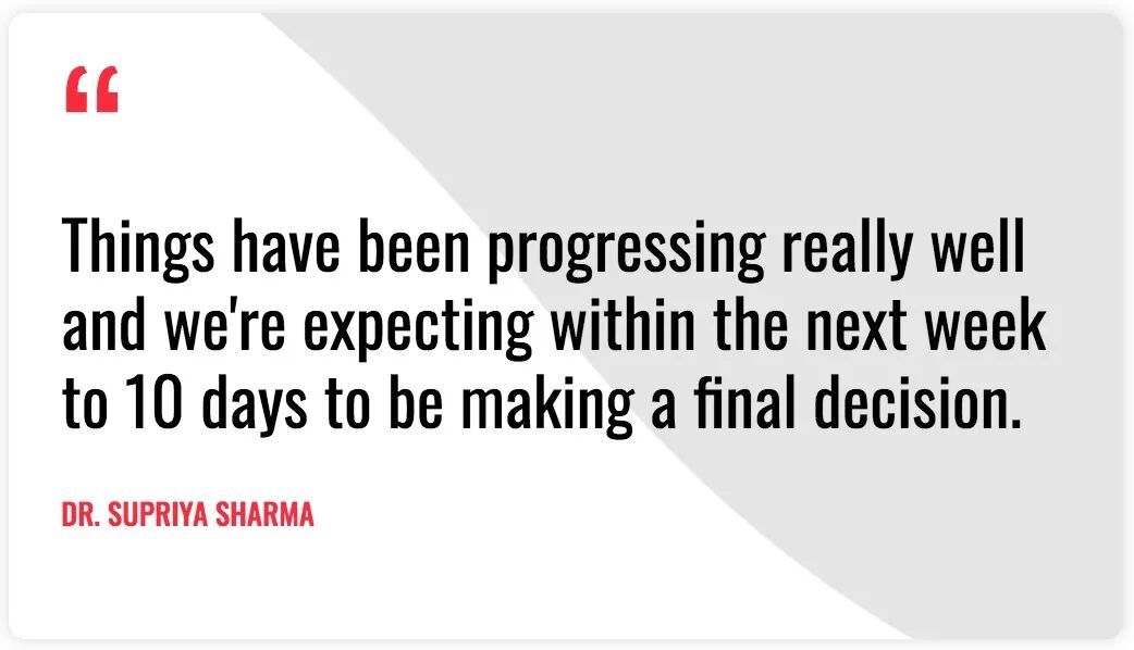 Inc.(强生公司旗下的一支),目前虽然不能拿出具体的审核时间线,但是一切审批工作都进展顺利,有望在10天之内完成审批工作。