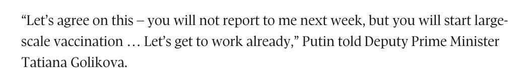 普京在向副首相Tatiana Golikova下达指令时一如既往的维持了霸道总裁范:“答应我,下周不要再向我汇报了,下周这个时候我希望你已经开始大规模接种。咱们开搞吧。”