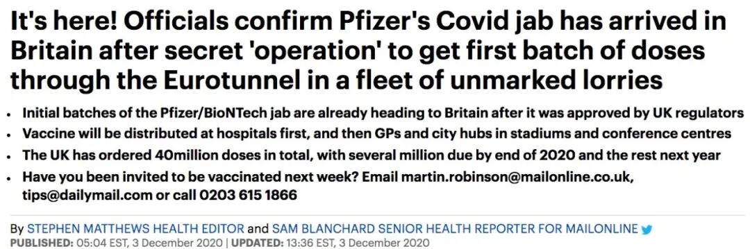 全球各国都在紧锣密鼓地准备着疫苗的接种。早在这个消息传出的前一天,英国方面已宣布通过了辉瑞疫苗的审批(美国FDA将于本月10号批准这款疫苗,而英国已经批准了,可见鲍里斯是真的很着急)。而且英国卫生部放消息称第一批辉瑞疫苗已经于星期四当天通过“秘密渠道”运抵英国。
