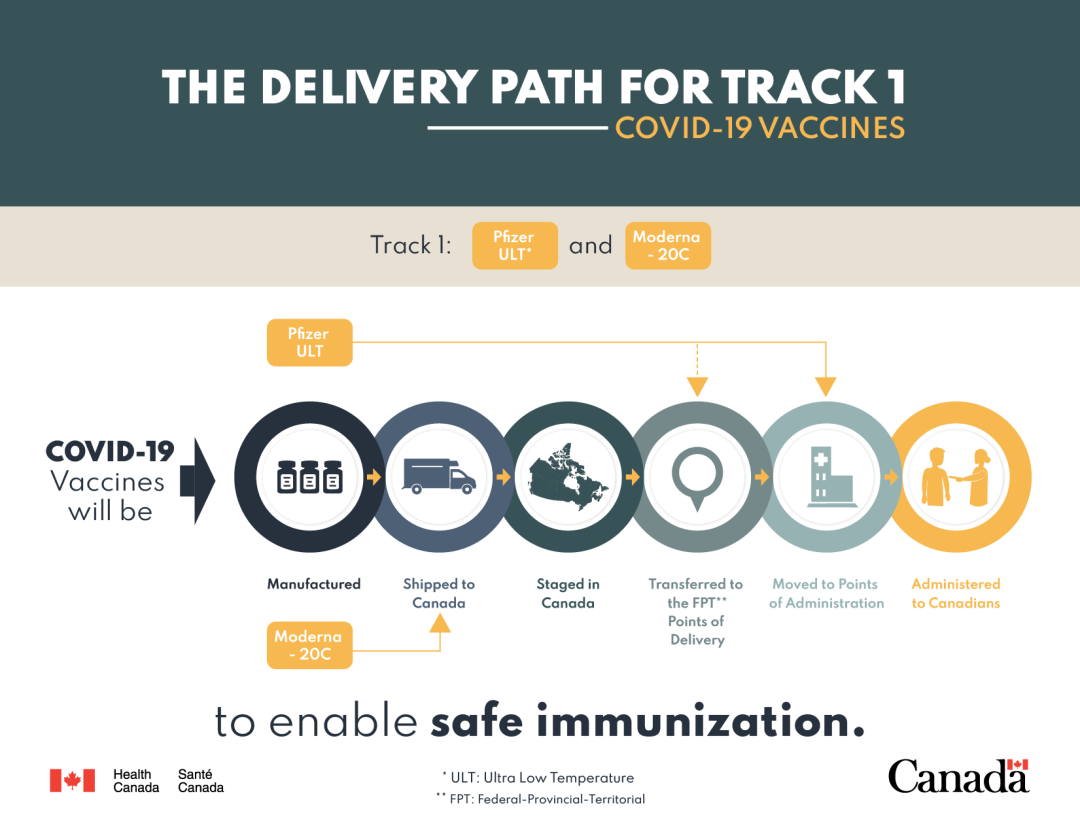其中首批辉瑞疫苗将直接送往各省,而Moderna疫苗将先集中送往加拿大某地,然后再由该地运往全国各处。