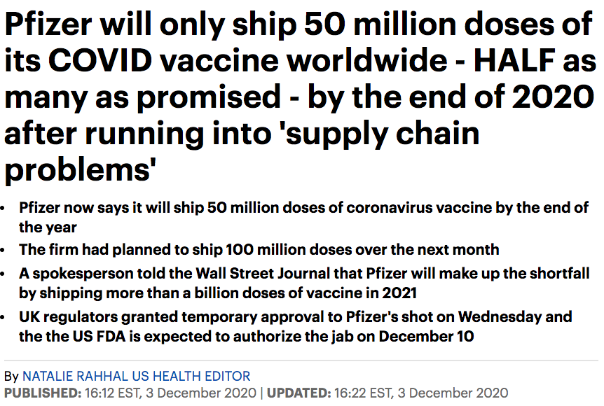就在各国摩拳擦掌准备迎接辉瑞的首批疫苗时,产品供应链传来噩耗:年底前辉瑞将只能送出原定承诺的一半剂量(原本承诺造出1亿支,目前只能达到5000万)。
