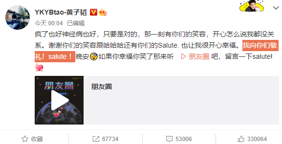 原来,在昨晚黄子韬的直播中,他一直在重复这句话;就连发现自己因昨晚的直播上热搜之后,在回应中又又又重复了遍salute!