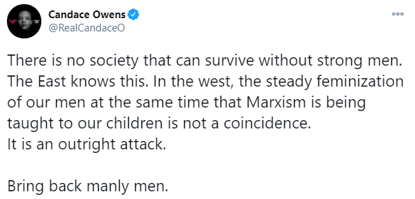 一位名叫 Candace Owens的评论员甚至直接批评称:男性必须得是强壮的社会才能得以持续啊。