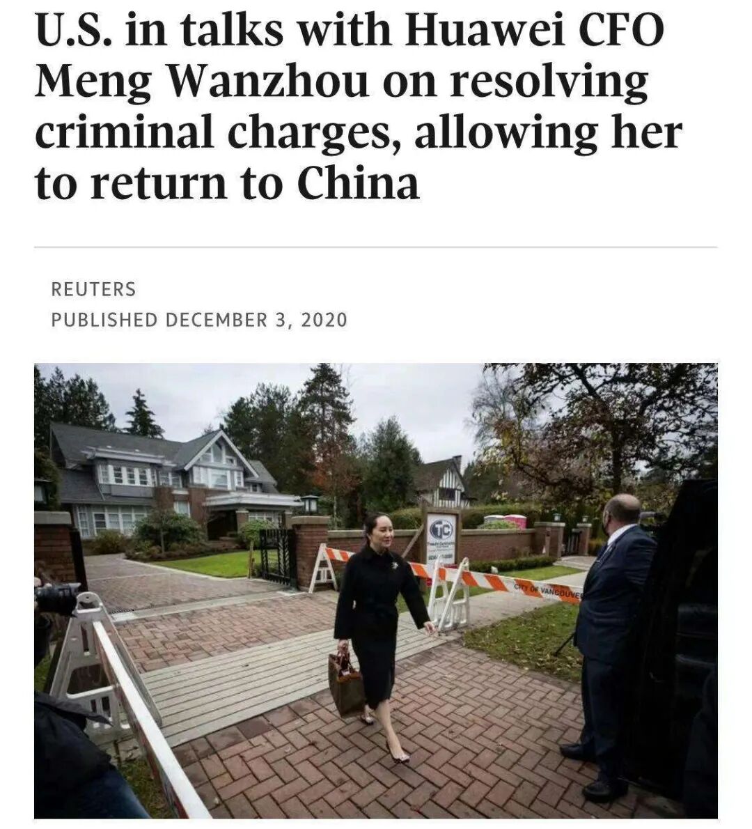 2020年12月3日:美国司法部正式出面,与孟晚舟的律师团队讨论一项协议,该协议将允许她从加拿大返回中国。